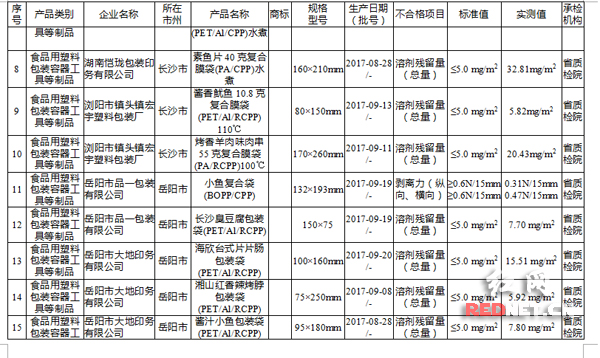 在此次公布的食品相關(guān)產(chǎn)品質(zhì)量抽查不合格產(chǎn)品及其生產(chǎn)者名單中,不少知名企業(yè)包裝袋紛紛被點(diǎn)名:由寧鄉(xiāng)中湘軟包裝有限公司生產(chǎn)的加加味精100克復(fù)合膜袋;由株洲縣宏濤塑料印刷制袋廠生產(chǎn)的湘潭鋪?zhàn)訖壚贫Y包袋;由岳陽(yáng)市大地印務(wù)有限公司生產(chǎn)的海欣臺(tái)式片片腸包裝袋,還有克明長(zhǎng)壽掛面包裝袋的橫向剝離力也被檢出低于相關(guān)標(biāo)準(zhǔn)要求。