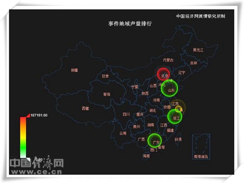 從時(shí)間地域聲量排行圖可以看出,北京、上海、廣東等地區(qū)相關(guān)輿情熱度較高。