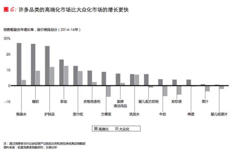 據(jù)貝恩聯(lián)合凱度消費(fèi)者指數(shù)發(fā)布的《2017中國快消品市場報(bào)告》報(bào)告顯示,中國消費(fèi)者正不斷表現(xiàn)出對(duì)健康產(chǎn)品或更優(yōu)質(zhì)生活的偏好,出現(xiàn)較為顯著的高端化趨勢(shì)。