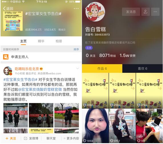 近兩年短視頻領域高速發(fā)展,而年輕人在短視頻上消耗的時間也越來越多。宏寶萊炭燒酸奶雪糕在抖音上建立自己的平臺,并試圖將“告白”這一溝通化的情感符號強化,進行與年輕消費者之間的溝通,通過日?;倪\營帶出產品的特性,6條視頻已經累計1.5w的贊和數千粉絲,而通過這樣長期的情感溝通,宏寶萊炭燒酸奶雪糕也希望更多的消費者一起參與互動“玩”起來,真正實現產品的互動功能。