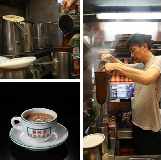 在煮茶器皿上,蘭芳園創(chuàng)始人林先生使用特制黃銅小壺,并嚴(yán)格控制煮茶時間,使煮出的茶不會太苦不會太濃,恰倒好處。用棉衣內(nèi)層的細(xì)布特制沖茶袋,充分過濾使奶茶更加細(xì)膩,而這也正是蘭芳園絲襪奶茶名稱的由來。憑借多年經(jīng)驗積累,林先生更是創(chuàng)立了“八手”撞茶法,將茶葉的香味完全釋放到熱水里,口味濃厚。