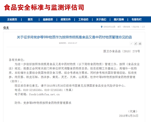 記者從食品安全標準與監(jiān)測評估司獲悉,結合我國傳統(tǒng)飲食習慣,綜合考慮地方需求,同時參考相關國際管理經(jīng)驗,黨參、肉蓯蓉、鐵皮石斛、西洋參、黃芪、靈芝、天麻、山茱萸、杜仲葉等9種物質(zhì)擬將被增補至食藥物質(zhì)目錄,現(xiàn)正征集相關意見。