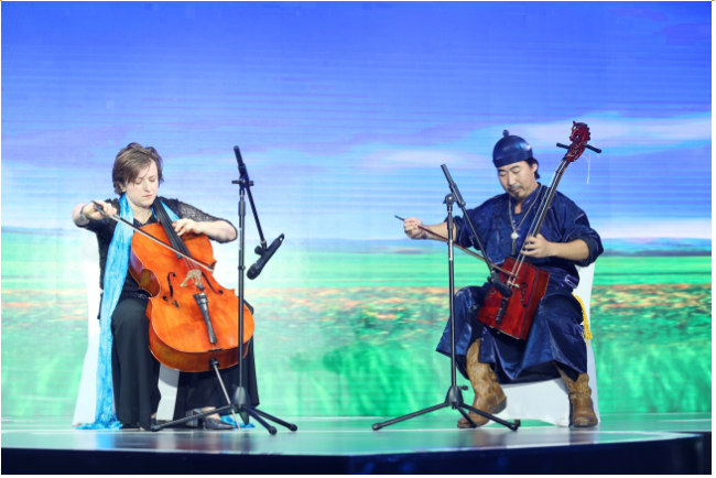 來自錫林郭勒盟的烏蘭牧騎演出隊(duì)與德國廣播交響樂團(tuán)的大提琴首席Joanna Sachryn、德國女高音夏娃文格絲等藝術(shù)家為現(xiàn)場嘉賓帶來一場中西方文化交融的藝術(shù)盛宴。