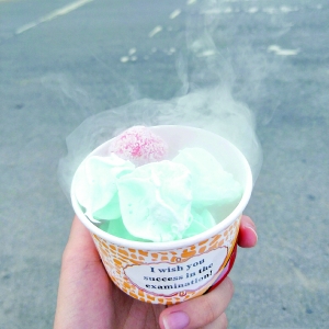 “前天,我和孩子在南鑼鼓巷逛街的時候,發(fā)現(xiàn)有個攤位上圍滿了人,攤位上方的招牌寫著‘冒煙冰淇淋,你不能不吃’的招牌,攤位前很多人手里拿著一個冒著煙的小碗在吃。”市民蘇女士反映,孩子看到后說這個冰淇淋在網(wǎng)上很火,一定要吃。“我擠上去買了一份,20元。只見賣家先把奶油倒入鍋中,隨即拿出一瓶液體,緩緩把液體倒入攪拌好的奶油中,只見鍋中不斷冒出白色煙霧,然后很快奶油就凝固了,整個過程非??欤€沒等我反應過來,會冒煙的冰淇淋已經(jīng)完成了。”蘇女士說,后來她問了商家才知道,原來他倒進去的是食用液氦。“也不知道安全不安全,但是這東西到底能不能放在食物里???”