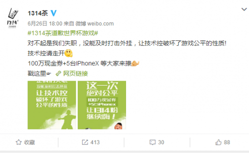 近日,1314茶微信公眾號上出現(xiàn)了一則“另類”聲明,對日前出現(xiàn)的游戲漏洞問題進(jìn)行詳細(xì)解釋與道歉。原來,在“玩游戲贏iphonex”活動中,有玩家反映排位第一名的玩家可能存在作弊問題。對此,1314茶通過積級調(diào)查發(fā)現(xiàn),按照游戲的玩法,第一名120秒的成績確實幾乎不可能實現(xiàn)。隨即拿出處理意見,并表達(dá)歉意。