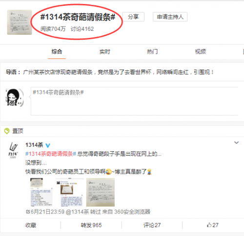 在很多網(wǎng)友認(rèn)為1314茶的世界杯活動會在游戲中圓滿落幕時,1314茶的“奇葩請假條”又高調(diào)登場。起源于一位員工需要請假盯緊“輸球可能會砸電視的男朋友”,爆笑理由獲得不少關(guān)注。請假條上,領(lǐng)導(dǎo)的神回復(fù)也成為“網(wǎng)紅請假條”的神助力。“別讓他上樓頂”,“不同意,曠工吧,一天才200!”一時間,這張請假條引來轉(zhuǎn)發(fā)無數(shù),火爆社交網(wǎng)絡(luò)。