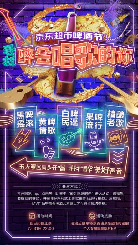 炎熱的夏季,怎么能少得了音樂和啤酒,自7月24日京東超市啤酒節(jié)“尋找醉會唱歌的你”挑戰(zhàn)賽在唱吧app上線以來,僅5天時間參與人數(shù)就已經(jīng)超過2000人,各賽區(qū)參賽作品播放量超30余萬次。而京東超市也適時加碼冠軍獎勵,正式宣布將選擇本次大賽的總冠軍擔(dān)任“京東超市首席啤酒體驗(yàn)官”,并準(zhǔn)備了一系列啤酒體驗(yàn)官誘的人權(quán)利,而再算上之前的大獎——總冠軍專屬黑膠唱片,這屆冠軍可能會有些“天生驕傲”了。