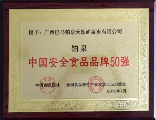 廣西巴馬鉑泉天然礦泉水有限公司榮獲“中國(guó)安全食品標(biāo)桿創(chuàng)建企業(yè)”、“中國(guó)安全食品品牌50強(qiáng)”兩大殊榮。