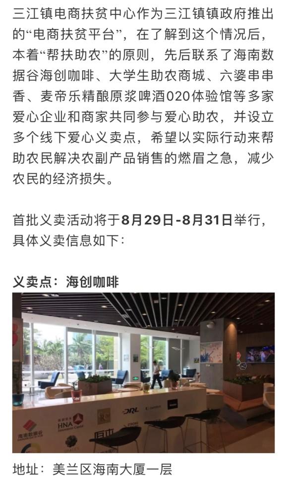 核心提示:繼海南數(shù)據(jù)谷海創(chuàng)咖啡幫助??谌?zhèn)政府進(jìn)行菠蘿愛心助農(nóng)義賣活動,取得較好的效果之后。2018年8月29日,海南數(shù)據(jù)谷海創(chuàng)咖啡再