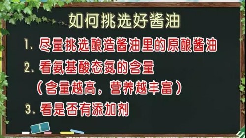 總結:選好醬油要 1釀造醬油、2氨基酸態(tài)氮含量高≥0.8g/100ml、3無添加 。