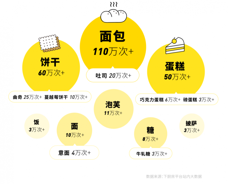 黃油作為從西方傳入的主要配料,在廚房中更多被用于制作西式餐點(diǎn)。在下廚房平臺上所有需要用到黃油的菜譜中,面包類菜譜被做過的次數(shù)最多,超過了110萬次其中吐司類被做過20萬次以上。餅干類中,曲奇類餅干和蔓越莓餅干被做過的次數(shù)最多,最受歡迎。意面和披薩成為少數(shù)非糕點(diǎn)類的黃油菜譜代表。