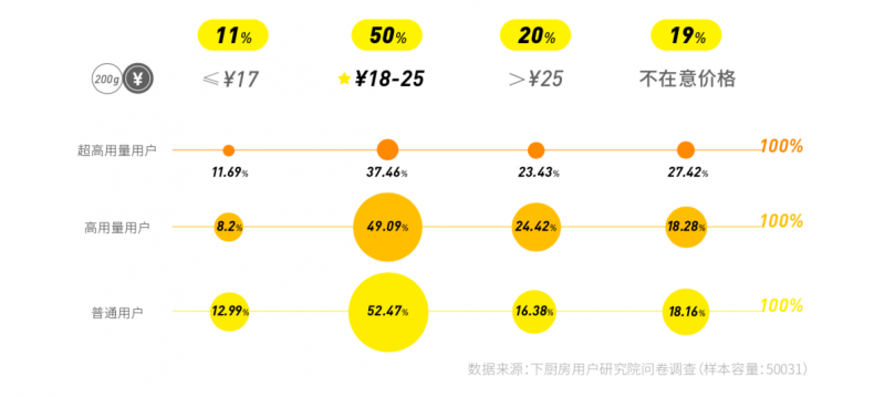 價(jià)格方面,以200g為基準(zhǔn)來定義價(jià)格區(qū)間,有一半的用戶選擇18~25元,每月用量超過200g的用戶對超過25元的黃油接受度稍高。