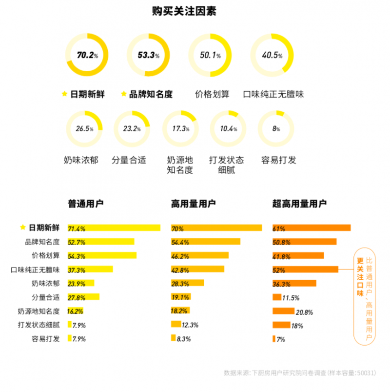 總體來說,選購商品時(shí)消費(fèi)者最關(guān)心黃油是否新鮮,其次關(guān)心其品牌的知名度和價(jià)格。但用量越高的用戶,對于黃油本身是否奶香濃郁、打發(fā)狀態(tài)、奶源地的情況,都有相對更高一些的要求。而普通用戶還停留在較為初級的階段,對于黃油的各種特性能對成品造成的影響則并不敏感。