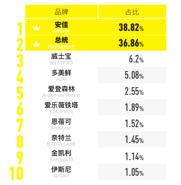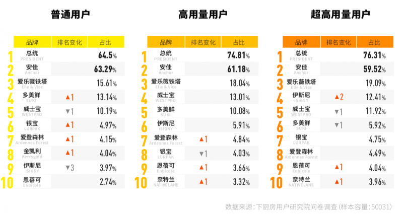 普通用戶最常用的品牌是安佳,而高用量和超高用量用戶最常用的品牌則是總統(tǒng)。