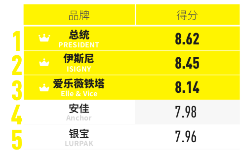 “口味榜”是綜合“奶味濃郁”和“純正無膻味”兩個指標(biāo)的打分結(jié)果。前三甲是總統(tǒng)、伊斯尼和鐵塔,安佳緊隨其后。