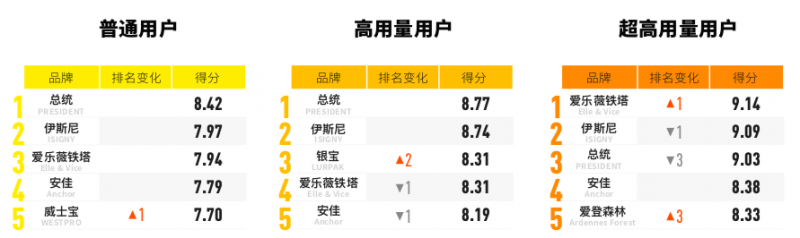 整體滿意度的前三名分別是總統(tǒng)、伊斯尼和愛樂薇鐵塔。在總榜排名第四的安佳,在高用量和超高用量用戶榜單中都排在第五。伊斯尼在超高量用戶榜單中得分最高,愛登森林也上升明顯。