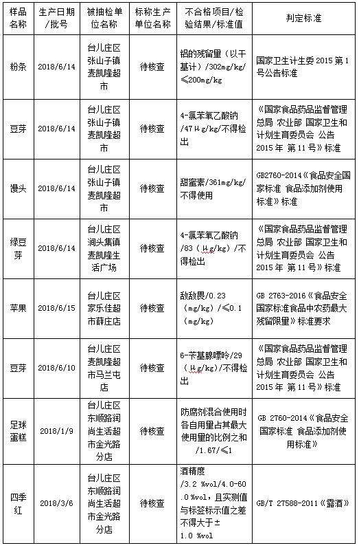 不合格食品包括粉條、豆芽、饅頭、綠豆芽、蘋果、足球蛋糕、四季紅等。