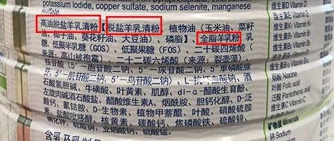 非全羊乳蛋白配方羊奶粉一般是在添加“濃縮乳清蛋白”“脫鹽乳清粉”“羊乳清蛋白”的同時(shí)加入了牛乳蛋白。