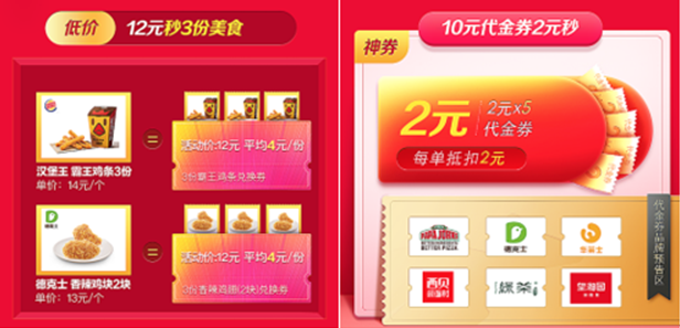 比如在“12元秒3份美食”的優(yōu)惠活動中,用戶可以以12元的價格,購買3份霸王雞條的美食兌換券,平均每份霸王雞條僅需4元。而一份漢堡王霸王雞條日常單價為14元,通過“囤券”,為消費者節(jié)省了30元支出,相當(dāng)于比3折更低。在“10元代金券2元秒”活動中,用戶則可以用2元的價格,秒殺購得5張面值2元的代金券,價值10元,總計為用戶節(jié)省80%的費用,算得上是外賣平臺上最大力度的折扣活動之一。