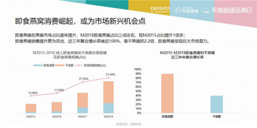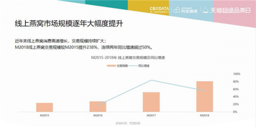 即食燕窩迅速消費崛起,近三年復(fù)合增長率接近100%,2018年線上燕窩交易規(guī)模較2015年提升238%,連續(xù)兩年同比增速超過50%。