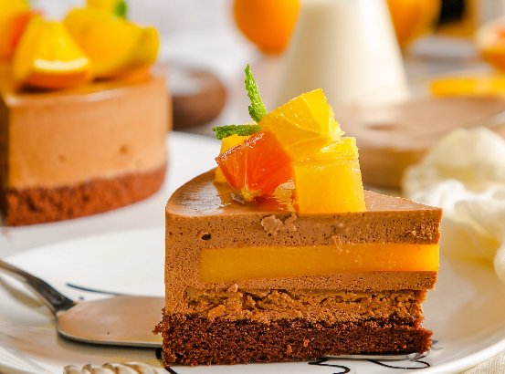 黑巧橙橙不僅采用了當(dāng)季果橙和法國總統(tǒng)淡奶油,還采用了來自巧克力王國比利時(shí)百年品牌百樂嘉利寶生產(chǎn)的黑巧克力,可可脂純度高達(dá)54.5%。高純度的黑巧克力和法國總統(tǒng)淡奶油碰撞在一起,交織出濃濃可可味的巧克力慕斯,中和了奶油的甜,而慕斯層的新鮮果橙肉又中和了巧克力天然的苦澀,成就了這款從外觀到滋味都不錯(cuò)的黑巧橙橙。