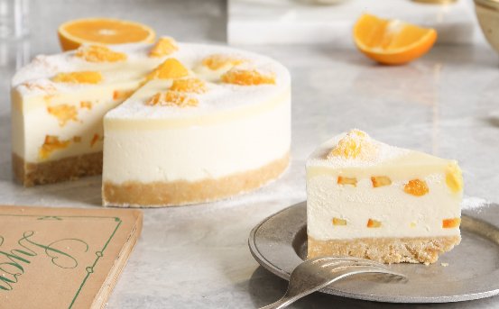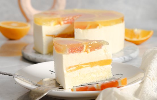橙橙芝士選用了當(dāng)季贛南臍橙作為原材料,贛南臍橙果型飽滿,果肉香甜,果汁漫溢,能帶來滿滿的時(shí)令味道。贛南臍橙與法國總統(tǒng)淡奶油調(diào)配出的橙汁慕斯覆蓋在酸奶芝士慕斯上,帶來雙重混合口味慕斯,配合著糖制熬煮橙肉、橙皮,絲滑慕斯?jié)M載鮮橙肉,口味清新怡人。