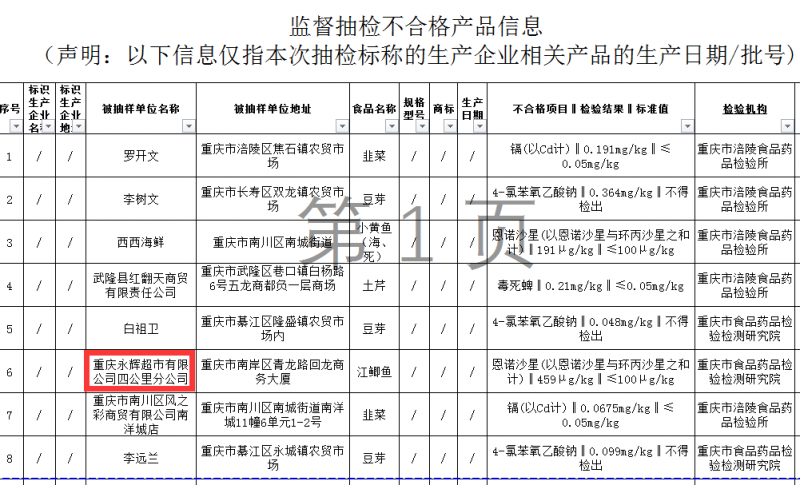 2019年4月30日,重慶市市場監(jiān)督管理局發(fā)布關(guān)于17批次食品不合格情況的通告(2019年第13號),重慶市市場監(jiān)督管理局組織抽檢食用農(nóng)產(chǎn)品512批次樣品,不合格樣品17批次,又有兩永輝超市被通報(bào),永輝超市從4月25日到4月30日僅僅6天內(nèi)共8批次食品因抽檢不合格被通報(bào)。