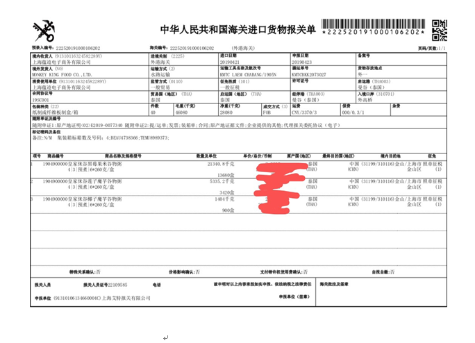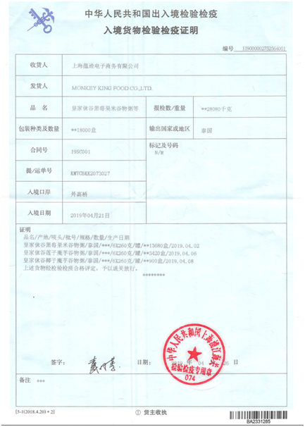 4月26日,一批來自泰國的皇家侎谷既食黑莓果米谷物粥抵達(dá)上海浦江口岸。泰國黑莓果米色呈深紫,氣味香甜兼具泰國茉莉香米柔軟、芬芳的特點(diǎn)。黑莓國米營養(yǎng)價(jià)值極高,在泰國廣受歡迎,售價(jià)也較高。