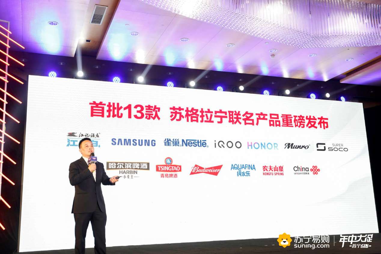 5月15日在蘇寧618年中大促發(fā)布會(huì)上,蘇寧易購總裁侯恩龍現(xiàn)場(chǎng)發(fā)布了首批蘇格拉寧聯(lián)名款產(chǎn)品,首批一共13款,聯(lián)名款品牌分別為三星、榮耀、iQOO、中國聯(lián)通、雀巢、江小白、哈爾濱啤酒、青島啤酒、百威、農(nóng)夫山泉、純水樂、門羅、速珂,涉及到消費(fèi)電子、快消、電動(dòng)車等多個(gè)品類,蘇格拉寧這個(gè)萌物IP,一時(shí)間非常搶手,成為多個(gè)品牌聯(lián)名的對(duì)象。