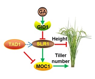 中國科學院遺傳與發(fā)育生物學研究所植物基因組學國家重點實驗室李家洋研究組長期致力于對水稻株型調(diào)控機制的解析,克隆了調(diào)控水稻分蘗形成的首個關(guān)鍵基因MOC1(Monoculm 1)(Li et al., Nature, 422: 618-621, 2003)及其調(diào)控基因TAD1 (Tillering and Dwarf 1)(Xu et al., Nat Commun, 3: 750, 2012)。近期,李家洋研究組在水稻株高與分蘗協(xié)同調(diào)控的分子機理研究中取得新進展,發(fā)現(xiàn)GA缺陷突變體分蘗數(shù)的增加是由于促進分蘗芽的伸長而非影響分蘗芽的起始導致的。進一步研究發(fā)現(xiàn)GA信號通路中的關(guān)鍵抑制因子DELLA蛋白SLR1可以直接與MOC1蛋白發(fā)生相互作用。SLR1能夠通過抑制MOC1蛋白的降解從而促進分蘗的伸長。GA處理后,SLR1蛋白降解,進而無法抑制MOC1蛋白的降解,導致MOC1蛋白減少,植株表現(xiàn)出株高增加、分蘗數(shù)減少的表型。研究還發(fā)現(xiàn)SLR1對MOC1的抑制效應并不依賴于TAD1途徑,且GA信號對株高和分蘗的調(diào)控分別影響不同的下游基因,為打破株高與分蘗的連鎖效應提供了可能性,從而為分子設(shè)計育種提供理論基礎(chǔ)。該研究解析了赤霉素信號協(xié)同調(diào)控水稻株高與分蘗的分子機理,是該領(lǐng)域的一項重要進展。