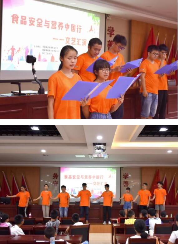 活動當(dāng)天,現(xiàn)場座無虛席、氣氛活躍。以播放食品安全相關(guān)宣傳片拉開序幕,實踐團(tuán)成員隨后向當(dāng)?shù)厍嗌倌暾故玖水惒始姵实难莩?,詩朗誦以飽含情感的聲音深深感染了在場每位聽眾,此外成員展現(xiàn)了大合唱、歌舞表演等,耳熟能詳?shù)母枨钆渖鷦踊顫姷谋硌?,同時穿插著相關(guān)食品安全知識,青少年在臺下積極參與互動。