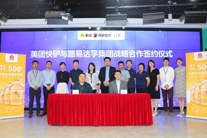 圖為美團(tuán)快驢進(jìn)貨與路易達(dá)孚集團(tuán)戰(zhàn)略合作簽約現(xiàn)場