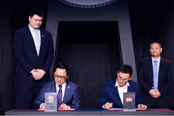 盼盼食品集團(tuán)董事長(zhǎng)蔡金垵、總經(jīng)理蔡丕鵬與CBA聯(lián)盟董事長(zhǎng)姚明、CBA聯(lián)盟CEO王大為合影。