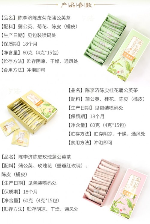 陳李濟蒲公英系列花茶成分就像三款的名字一樣,道地長白山蒲公英根、新會陳皮,再分別加入桂林桂花、黃山貢菊、平陰重瓣紅玫瑰。十多道精制工序,純提香,無添加香精、防腐劑等,安全更健康。