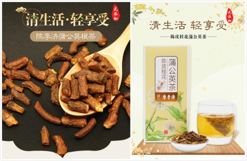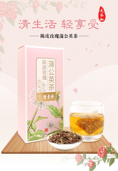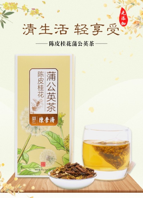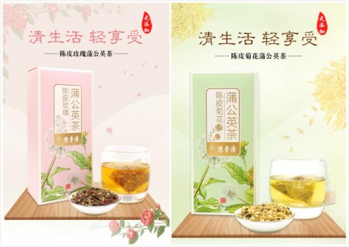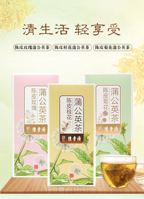 因蒲公英有清熱解毒,護肝等作用,陳李濟優(yōu)選長白山蒲公英根為主料,桂林桂花、黃山貢菊和平陰玫瑰為茶香的基調(diào),加入陳皮運化調(diào)和。將原朵花苞與新會陳皮做破碎處理,出味更快,更易人體吸收。成為了三款風味獨特的花茶。