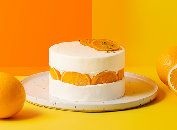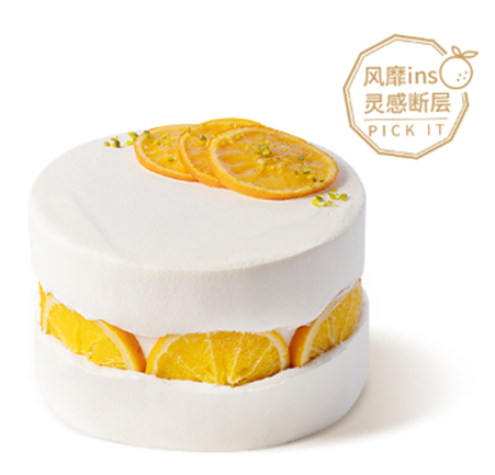 此次,諾心推出的新品蛋糕的外觀設(shè)計打破了以往奶油蛋糕單調(diào)的外觀,獨特的斷層式設(shè)計突破了固有的外觀界限。斷層蛋糕的表面和中間斷層處點綴著烘烤過的糖水橙片,而大面積占據(jù)斷層處的大片橙子切片,在視覺上把蛋糕一分為二,奶油的加入打造出邊緣處的不規(guī)則之感,讓好奇的觀者從潔白的奶油蛋糕中窺探到斷層蛋糕的神秘內(nèi)在。元氣橙片的出現(xiàn),也仿佛冬季潔白世界里闖入的叛逆者,潔白奶油中的一點橙色讓人感受到暖意。表面特別加入的烘烤過的開心果碎,也讓蛋糕外觀更為俏皮生動。