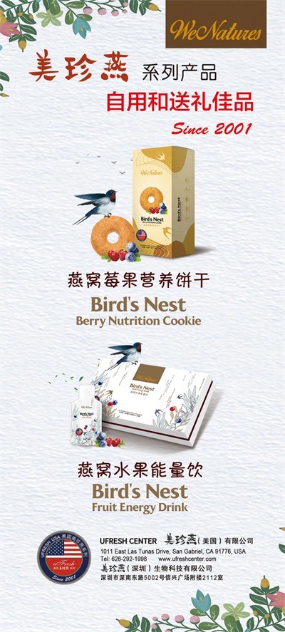 美珍燕 (英文UFRESH),熱銷美國各地近20年,在美國洛杉磯有自己的實(shí)體旗艦店,在紐約、舊金山、芝加哥、休斯頓等多個(gè)城市有眾多實(shí)體店的代理商。旗下系列產(chǎn)品不但在美國本土市場上,看得見、買得到,而且經(jīng)過美國亞馬遜公司的嚴(yán)格審核后,在亞馬遜官網(wǎng)上都可直接訂購,消費(fèi)者們遍布世界30多個(gè)國家與地區(qū),成為快節(jié)奏與壓力大的都市人每天的必需品,前NBA球星BARRY ORMS等也是美珍燕的長期忠實(shí)顧客。美珍燕旗下WeNatures燕窩莓果營養(yǎng)餅干和燕窩水果能量飲非常受歡迎、是復(fù)購率非常高的明星產(chǎn)品。