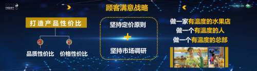 顧客滿意戰(zhàn)略,核心就是打造產(chǎn)品的性價(jià)比。“產(chǎn)品無(wú)外乎是品質(zhì)性價(jià)比和價(jià)值性價(jià)比,我們要徹底梳理和堅(jiān)守我們的定價(jià)原則,打造產(chǎn)品性價(jià)比。”百果園還提出,要做有溫度的水果店,“實(shí)際上就是要給人美感,要觸動(dòng)人心。要讓水果店有溫度,我們的員工、加盟商就要成為有溫度的人;要讓員工、加盟商成為有溫度的人,集團(tuán)就必須要有溫度。”