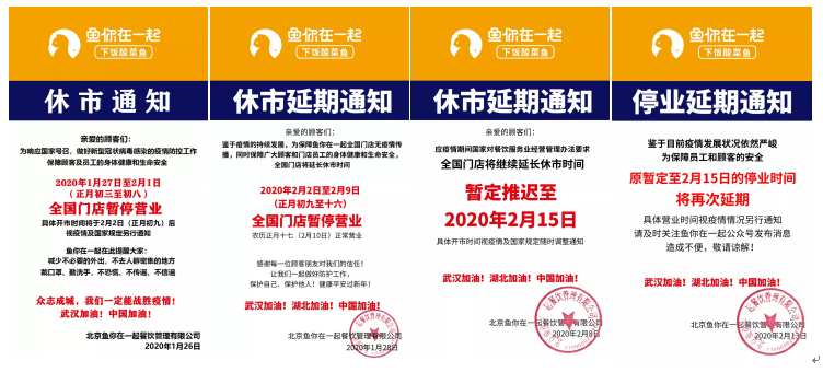 1月26日,為響應(yīng)全國大防疫精神,確保餐廳無疫情擴散傳播,魚你在一起總部決定全國門店自覺閉店暫停營業(yè)。雖然閉店會影響門店生意,但是考慮到員工安全、各家門店要擔起社會責任阻止疫情擴散,所以毅然決定下文要求門店閉店。