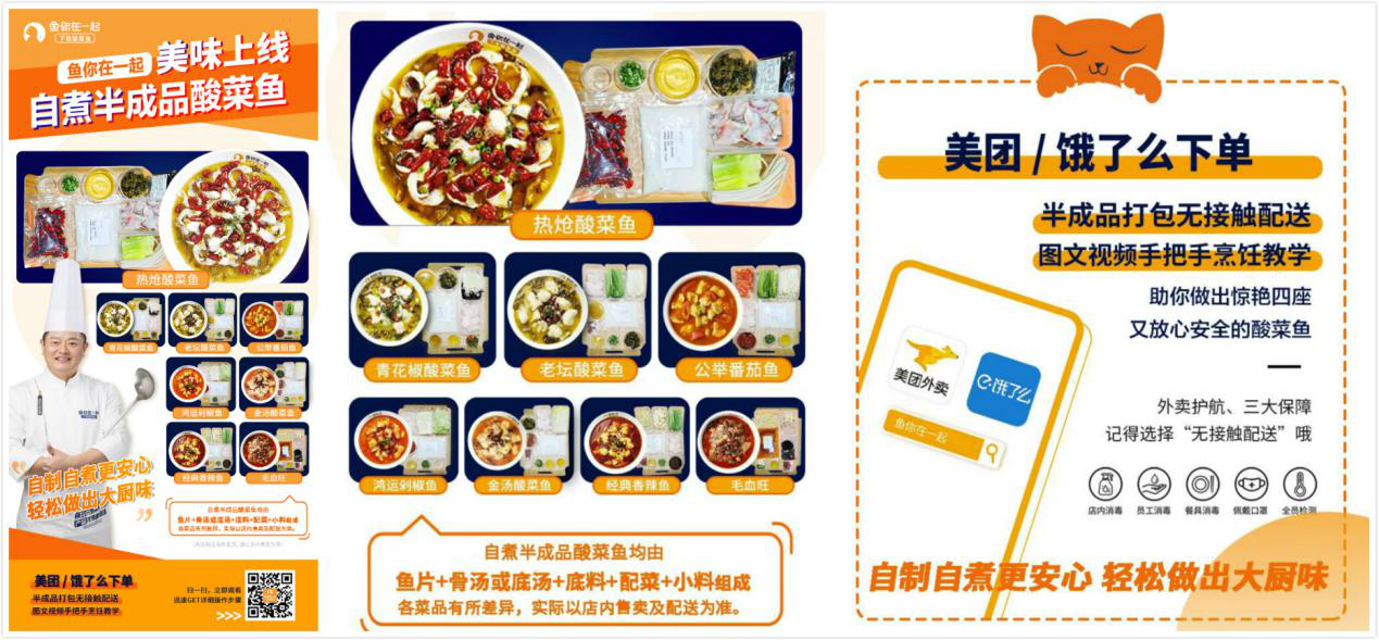 于是,魚你在一起總部在疫情后半場決定,把餐廳堂食的酸菜魚制作成半成品用外賣渠道送到顧客家里,讓顧客在家里也能享受到酸菜魚的美味。經(jīng)過半成品化的酸菜魚,不僅免去各種食材的采購,更是免去殺魚等繁瑣環(huán)節(jié),只需按照步驟操作就能成為一道美味。