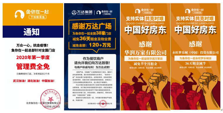 1月29日,魚你在一起總部第一時間率先決定發(fā)起“全國2020年一季度免收管理費”的支持行動,并竭盡全力幫助全國門店向商業(yè)綜合體遞交減租申請,向全國門店發(fā)出向業(yè)主主動提出減免房租的通知。