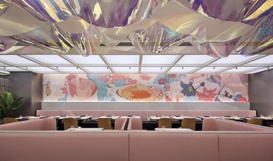 以黃記煌廣州云門NEW PARK店為例,門頭以大面積鋼化玻璃為主,通透明亮;進(jìn)門之后,左邊墻壁是古代屋檐紋樣的簡化,右邊墻壁則是黃記煌定制的御廚主題插畫,充滿歷史底蘊(yùn),也給人一種時(shí)尚清新之感。