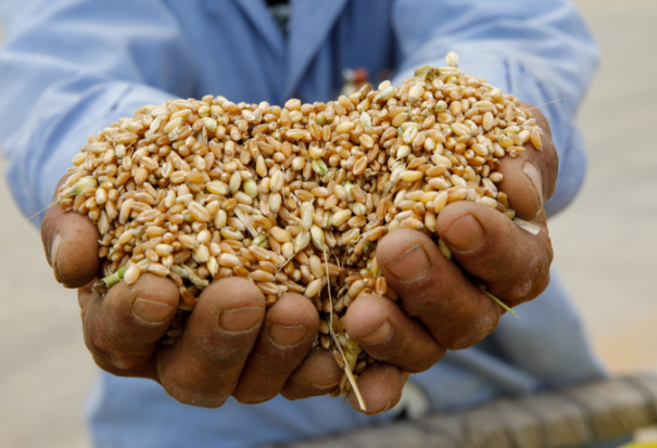 5月29日,在江蘇省連云港市贛榆區(qū)塔山鎮(zhèn)宋家?guī)X村農(nóng)民展示收獲的小麥。