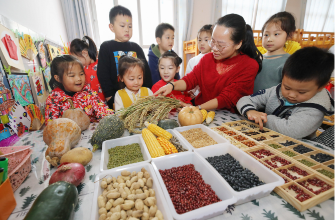 10月16日,江蘇連云港市贛榆區(qū)實驗幼兒園的小朋友們在老師的指導(dǎo)下辨識糧食。