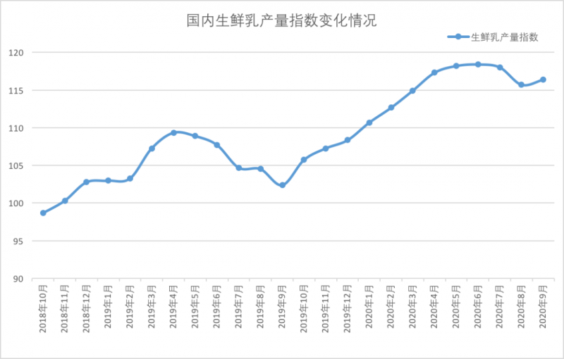 根據(jù)農(nóng)業(yè)農(nóng)村部對全國發(fā)證生鮮乳收購站生鮮乳產(chǎn)量跟蹤監(jiān)測,自去年9月份以來,國內(nèi)生鮮乳產(chǎn)量持續(xù)保持增長勢頭,截至2020年6月份,已經(jīng)連續(xù)增長9個月。進(jìn)入第三季度,產(chǎn)量開始出現(xiàn)下降,9月份出現(xiàn)回穩(wěn)。9月全國發(fā)證生鮮乳收購站生鮮乳產(chǎn)量指數(shù)為116.38(以2015年1月為基期100)。