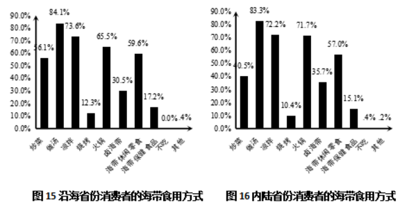 本次調(diào)查將消費者可能食用海帶的方式分為以下幾種:做湯、涼拌、火鍋、休閑零食、炒制、鹵制、海帶保健品、燒烤等。在多種多樣的食用方式中,沿海省份消費者和內(nèi)陸省份消費者最為喜愛的食用方式都是做湯(沿海省份的受訪者有84.1%選擇做湯,內(nèi)陸省份的受訪者有83.3%選擇做湯)、涼拌(沿海省份的受訪者有73.6%選擇涼拌,內(nèi)陸省份的受訪者有72.2%選擇涼拌)和火鍋(沿海省份的受訪者有65.5%選擇火鍋,內(nèi)陸省份的受訪者有71.7%選擇火鍋)。除最喜歡的食用方式之外,對比結(jié)果顯示,沿海省份消費者更加喜歡炒海帶(沿海省份的受訪者有56.1%選擇炒菜,內(nèi)陸省份的受訪者有40.5%選擇炒菜),而內(nèi)陸省份消費者更喜歡用海帶來做火鍋(沿海省份的受訪者有65.5%選擇火鍋,內(nèi)陸省份的受訪者有71.7%選擇火鍋)(圖15-16)。