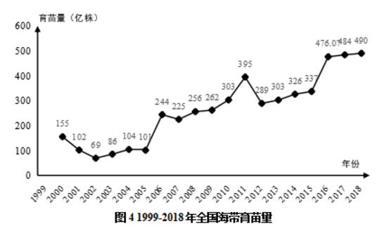 此外,圖4表明全國海帶育苗量從1999年~2018年總體處于穩(wěn)步上升的態(tài)勢。雖然1999年到2002年國內(nèi)海帶育苗總量在下滑,2011年有急劇的下降外,總體育苗量在增加。對比海帶年總產(chǎn)量和年育苗量可以發(fā)現(xiàn),海帶產(chǎn)量從2014年開始有大幅度增加,相比于2013年約增加了33.3%。雖然從2014年開始,海帶總產(chǎn)量逐漸增加,但是對比總產(chǎn)量和育苗量的產(chǎn)出和投入可以看出近年來海帶的邊際產(chǎn)量是逐漸下降的。可能是近年來全球氣溫變化以及水體污染等原因?qū)a(chǎn)帶來負面的影響,導(dǎo)致海帶育苗量的大量投入并不能帶來產(chǎn)量的高增長。