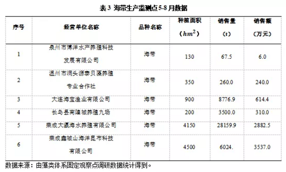 根據(jù)所檢測的企業(yè)和試驗站的情況來看,5月到7月最主要的藻類采摘作物是海帶,出塘量均以萬噸為單位,其中6月出塘量最高,為2.78萬噸,約占6月全國藻類作物總出塘量2.80萬噸的99.59%。其中山東榮成大瀛海水養(yǎng)殖有限公司6月海帶銷售量最高,約為1.98萬噸,銷售額達到1896.67萬。大連海寶漁業(yè)有限公司海帶銷售量也相對不錯,達到0.40萬噸,銷售額277.37萬。
