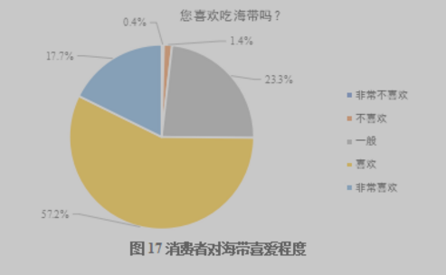 由圖中數(shù)據(jù)可知,有57.2%的消費者喜歡吃海帶,而且更是有17.7%的消費者非常喜歡吃海帶,僅有1.8%的消費者不喜歡或非常不喜歡吃海帶,另外還有23.3%的消費者認為一般。經(jīng)計算消費者對海帶的喜好程度(M=3.90,SD=0.702)較高,因此企業(yè)應(yīng)該對海帶消費市場有充足信心,消費者對海帶產(chǎn)品是有一定偏好的(圖17)。