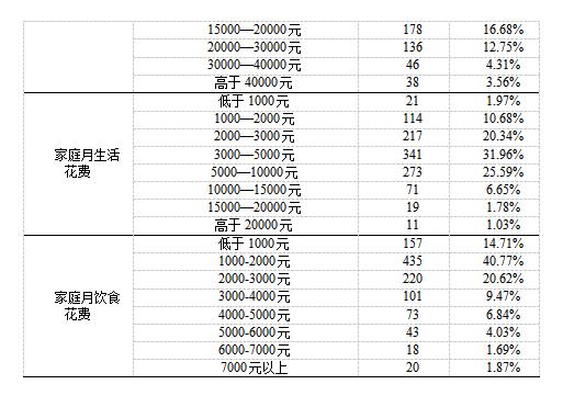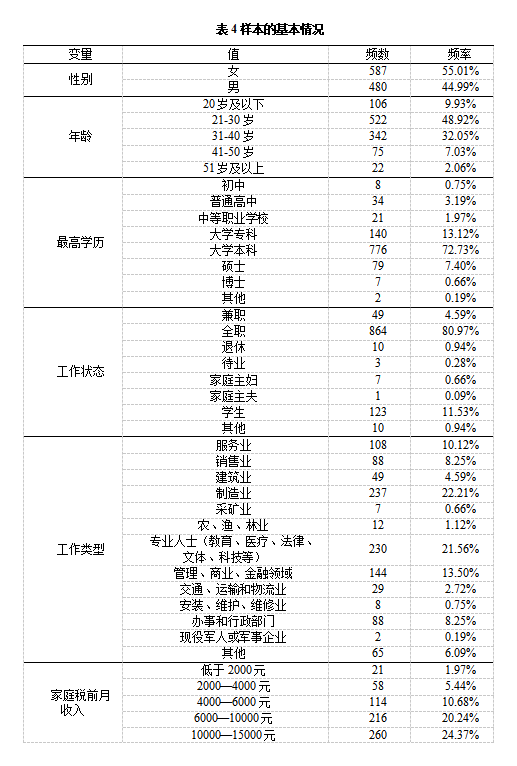 本次調(diào)查的受訪者中有587名女性(55.01%),年齡分布在16-74歲之間,平均年齡為29.98歲(SD=8.102),樣本的年齡覆蓋范圍較廣。樣本的家庭人口數(shù)分布在1-9之間,平均家庭人口數(shù)為3.64(SD=1.130),樣本的家庭規(guī)模覆蓋較廣。在受教育水平上,有80%以上的受訪者的學歷在大學本科及以上,這表明受訪者的學歷偏高。在工作狀態(tài)方面,有80.97%的受訪者為全職,有11.53%的受訪者為學生。在工作類型上,本次調(diào)查的受訪者的工作主要分布在制造業(yè)(22.21%)、專業(yè)人士(教育、醫(yī)療、法律、文體、科技等)(21.56%)、管理、商業(yè)、金融領(lǐng)域(13.50%)和服務(wù)業(yè)(10.12%)。在家庭月收入方面,本次調(diào)查的受訪者的家庭稅前月收入分布在6000-20000元(61.29%)之間,屬于中低收入水平。在家庭月生活花費方面,本次調(diào)查的受訪者的家庭月生活花費分布在2000-5000元之間(52.3%)。在家庭月飲食花費方面,本次調(diào)查有一半以上的(55.48%)受訪者的家庭月飲食花費在2000元以下,在飲食方面的投入較少。具體情況見表4: